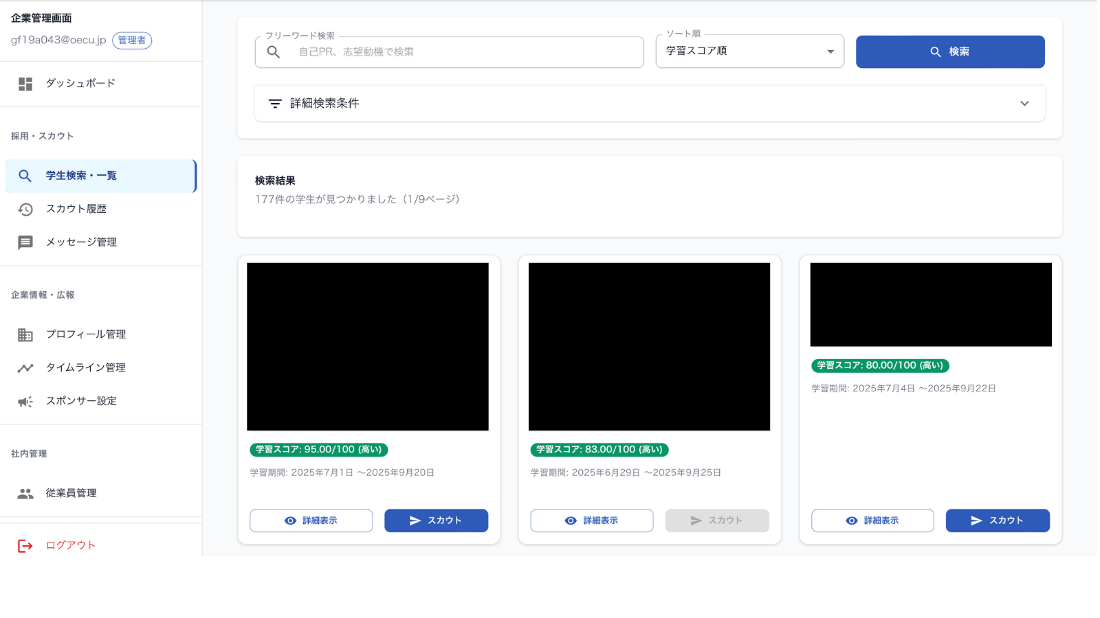 「ガクフドキャリア」では、大学生が学習した不動産行での実績をスコア化し、大学生にスカウトメッセージを送信することができる。