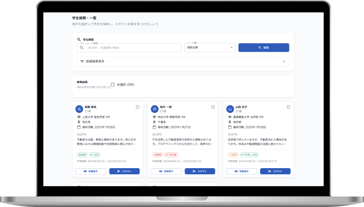 - 学習履歴・実践評価・面談記録を元に、要件に合う学生のみをレコメンド・ご紹介します。